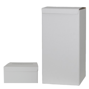 Eigenschaften: Bestehend aus solider doppelgewellten Wellpappe in der Farbe weiß/brau (außen weiß, innen braun), Auf Grund der stabilen Ausführung auch mehrfach verwendbar. Ausgestattet mit einem normgerechten Einwurfschlitz von 25 x 2 cm (LxB).